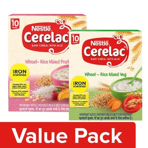 Nestle Cerelac Fortified Baby Cereal with Milk, Wheat-Rice Mixed Veg is a complementary food for babies from 10 months onwards. While infants and children have higher requirements of nutrients than adults, 2 serves of Cerelac Wheat-Rice Mixed Veg Cereal provides 99% of a baby’s daily need of iron. Also a source of 17 important nutrients including vitamins and minerals, Cerelac Wheat-Rice Mixed Veg Cereal is free from added colours, flavours and preservatives.
